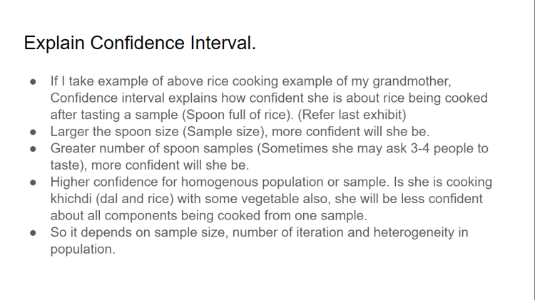 Always check if a 10 year old kid, any illiterate adult, your grandmother or for that matter, any sane person can easily understand your answer, irrespective of technicality and complexity of the question. It is very important that the answers are simple, lucid with zero pre requisite to comprehend and understand it. Auditing my answers on this trait while preparing has done wonders for me. I was asked “Explain concept of Confidence Interval”. I have put my answer in exhibit below.