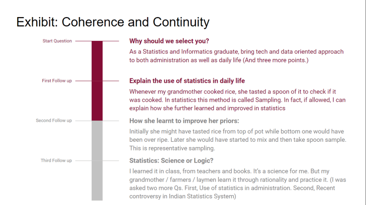This can be done in two ways. First, focus on bringing in points From DAF which are unique and found only in few profiles. From my profile, I guide my interview towards being a statistics graduate, product manager in a private company, worked in ride-sharing Startup, later as PMRDF in Naxal affected district, a curious traveller in Indian Railway(hobby) and my obsession with operations projects.