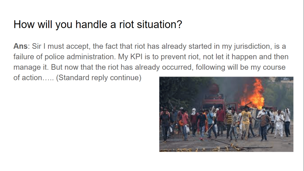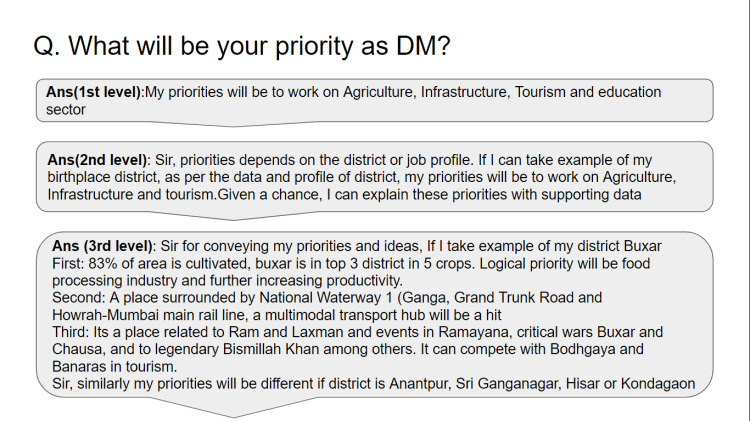 While preparing answers, check if you can be more specific and exact with ideas, reasons and still keep it crisp to finish the answer in 1 to 1.5 min. One can go even further and add a leading statement in the end as “similarly priorities will change if the district is Ananthpur, Sri Ganganagar, Narayanpur Or Hisar”. With such a leading end line, an aspirant is showing willingness to take more questions.