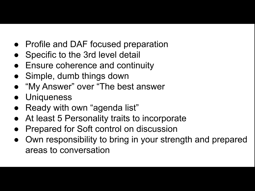 The core of preparation should be the focus on self, own personality and how to highlight personality traits. No aspect of preparation should be isolated from or independent of the profile, DAF and personality traits. Keeping this in mind, the following are the aspects which will make the 30 min discussion engaging for both panellists and candidate, and achieve good marks.