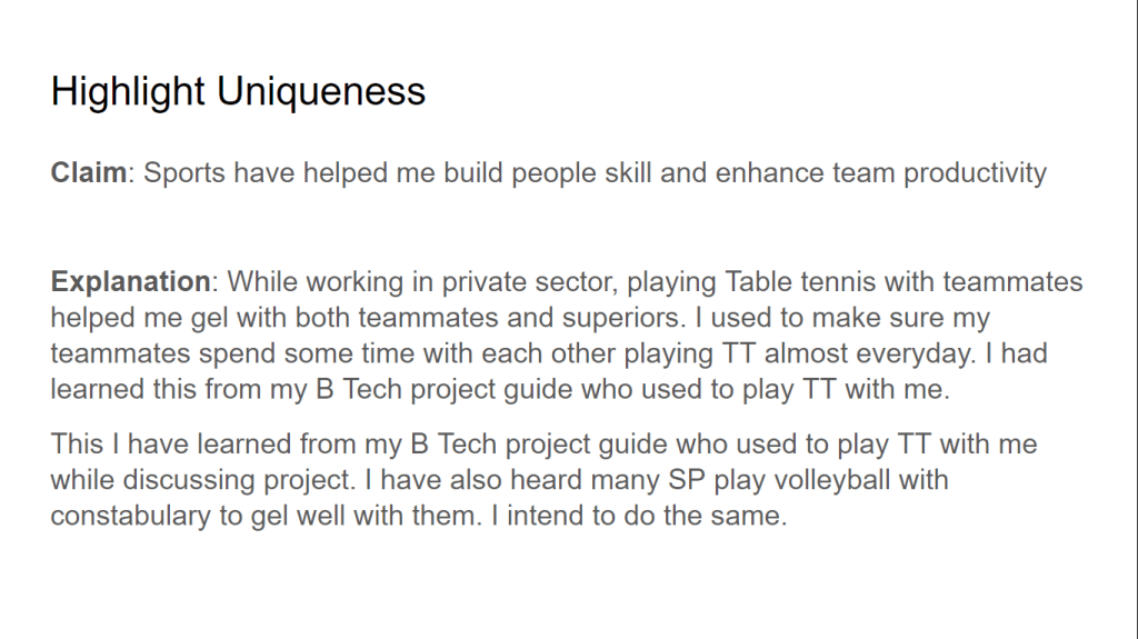 Here it is important to stay clear of cliche, obvious things or just static facts. So just highlighting “school awards” or “being from IIT” or “having worked in an MNC/Pvt company” or “worked with NGO” etc are not uniques. They are just static facts and convey nothing about our choices, interests.